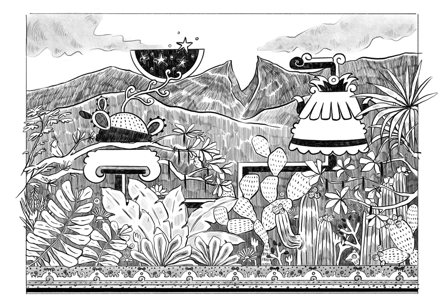 Las ilustraciones exhibidas aquí son parte de la exploración visual narrativa del Capítulo 2: Tepectli Monamictlan. Un título que funciona como metáfora del choque de dos realidades: la narrativa familiar con la que crecí de niña, en comparación con la realidad desde el punto de vista de entrevistas con mis familiares, que resulta en una historia más compleja. Y estos dibujos son mi interpretación de cómo estas historias viven en mi.